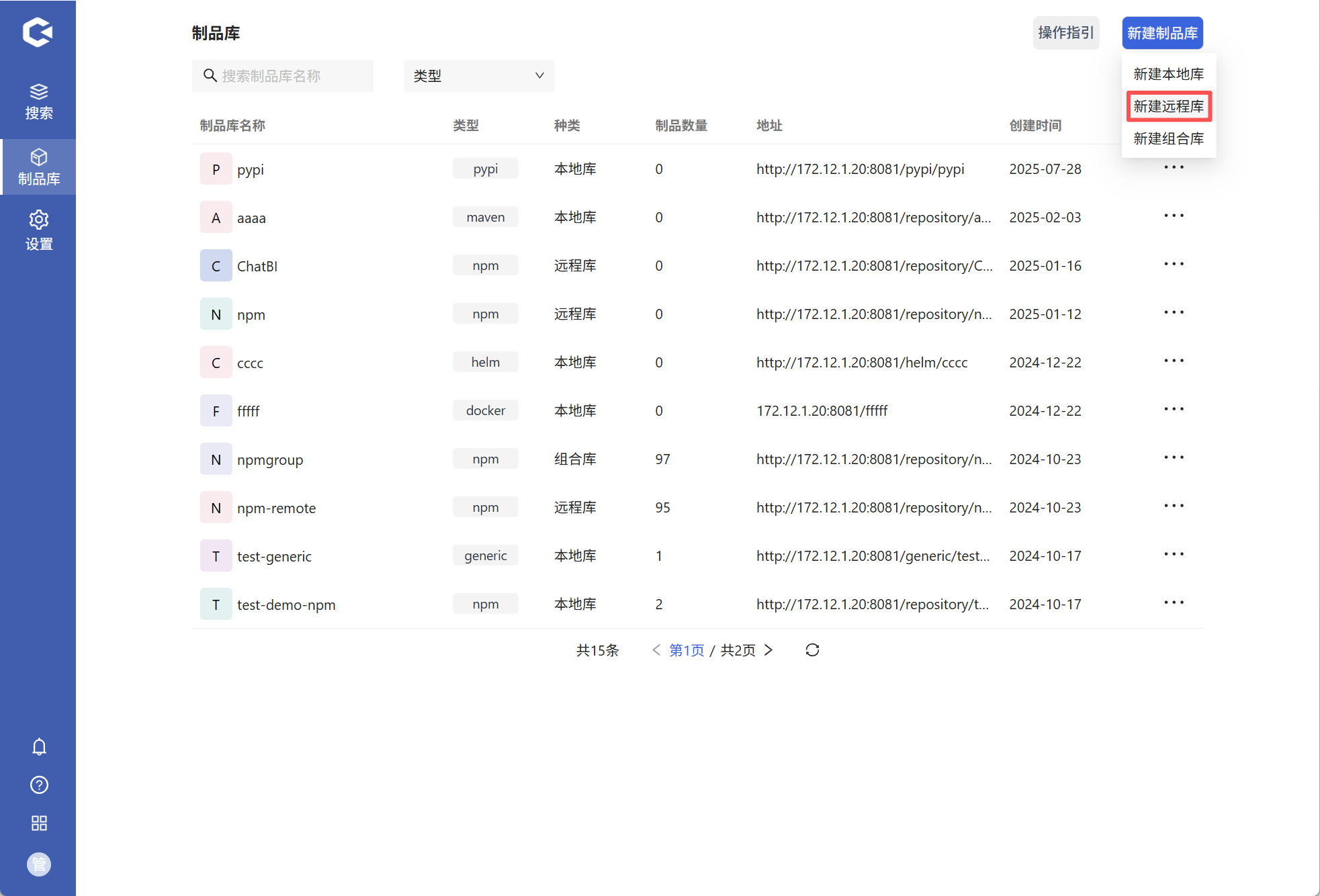 - 打开创建远程库界面:点击新建制品库选择新建远程库输入信息点击确认即可