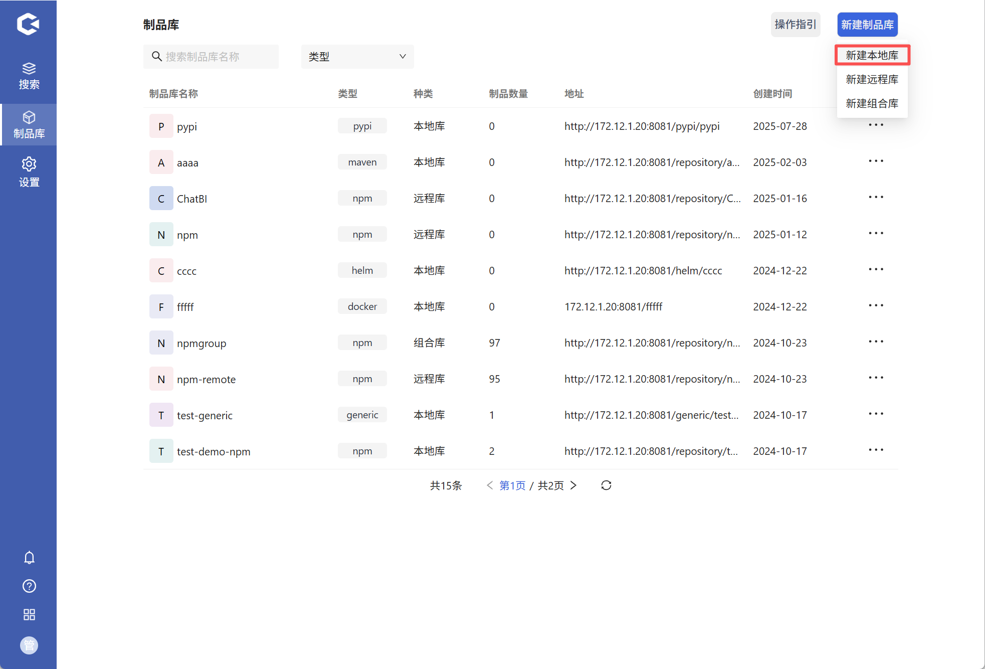- 打开创建本地库界面:点击新建制品库选择新建本地库添加信息点击确认即可