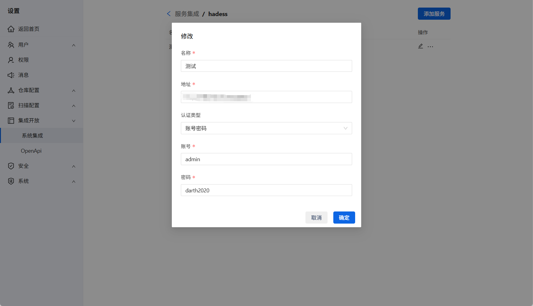 登录Hadess->系统设置->集成开放->服务集成,在Hadess下点击编辑,输入Hadess的访问地址。点击测试连接,当提示测试连接成功,说明Hadess地址无误。