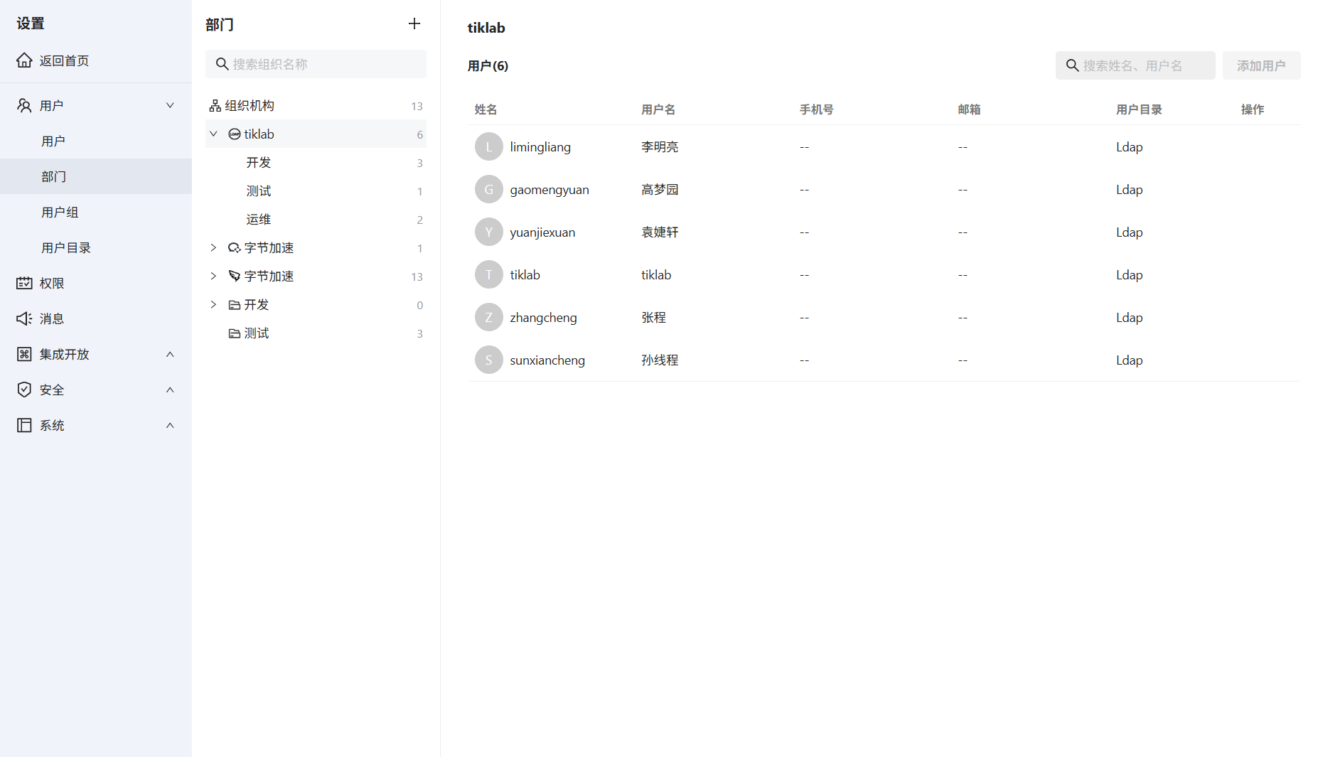 1.同步完成后可以点击部门,进行查看同步的部门与用户