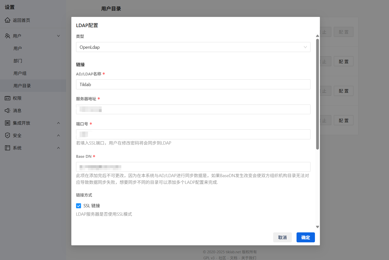 配置LDAP登录,首先需要填写LDAP的信息,开启LDAP后即可同步用户信息及登录。