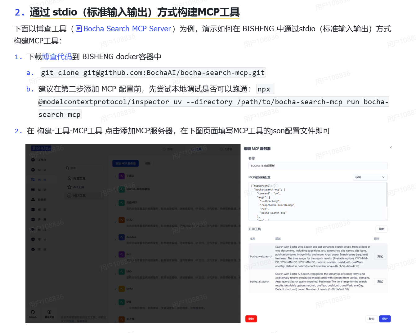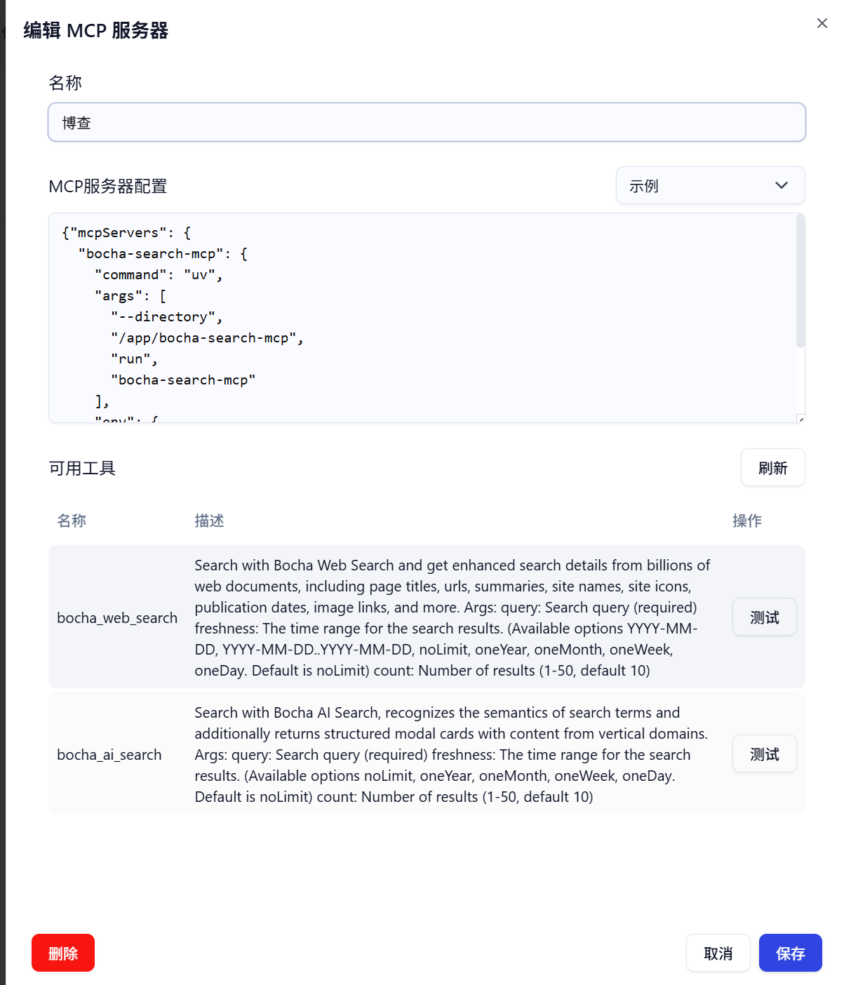 # 在毕昇前端页面的‘构建-工具-MCP工具’点击添加MCP服务器并填写以下json以获取博查工具