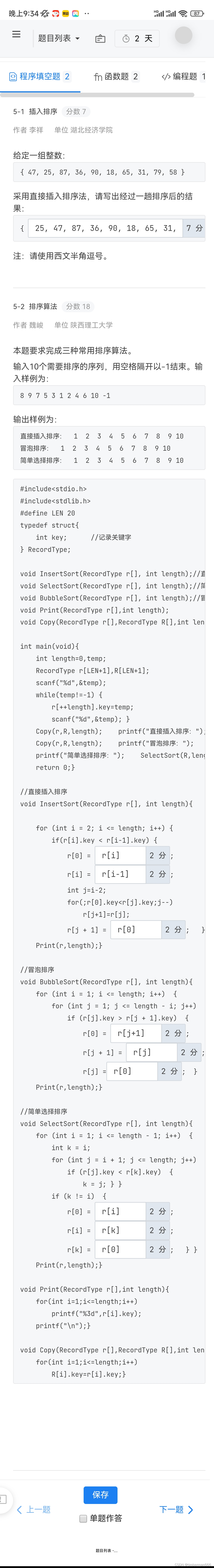 #include<stdio.h> #include<stdlib.h> typedef int KeyType; typedef struct { KeyType *elem; /*elem[0]一般作哨兵或缓冲区*/ int Length; }SqList; void CreatSqList(SqList *L);/*待排序列建立,由裁判实现,细节不表*/ void InsertSort(SqList L); int main() { SqList L; int i; CreatSqList(&L); InsertSort(L); for(i=1;i<=L.Length;i++) { printf("%d ",L.elem[i]); } return 0; } /*你的代码将被嵌在这里 */