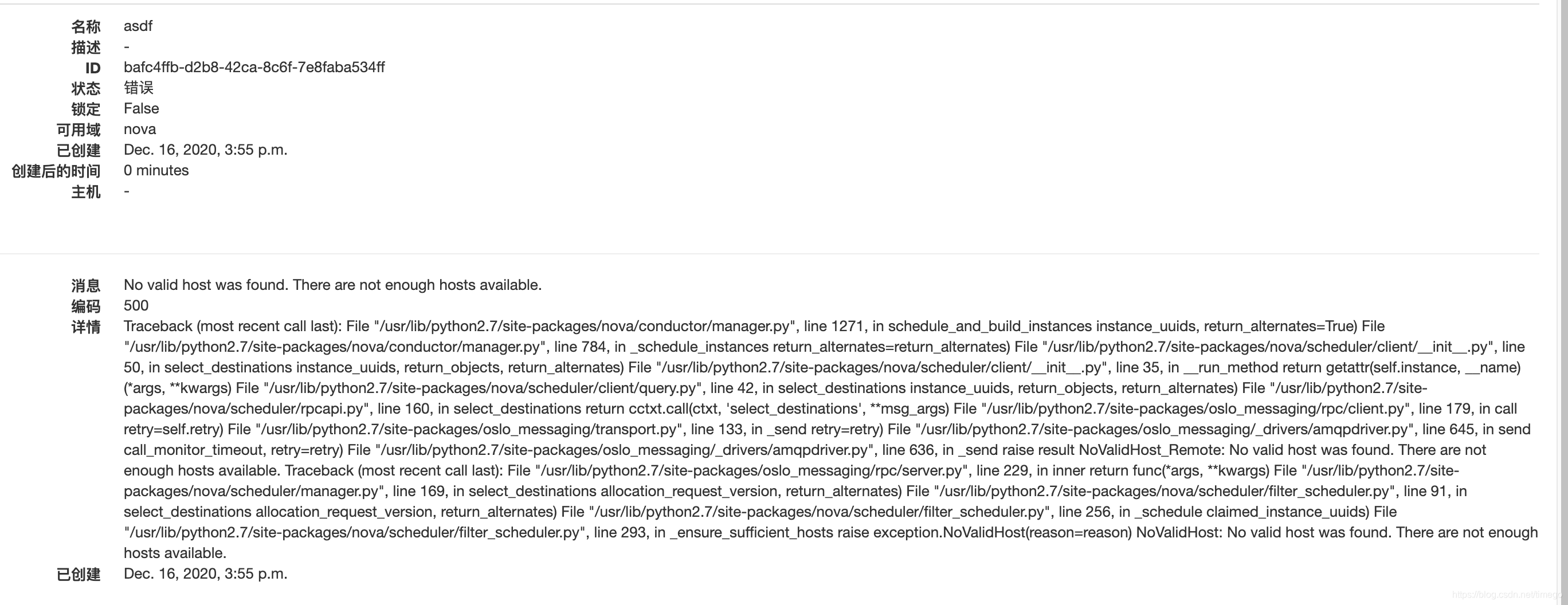 一套新起的OpenStack环境,在创建实例是发现报错。No valid host was found. There are not enough hosts available.