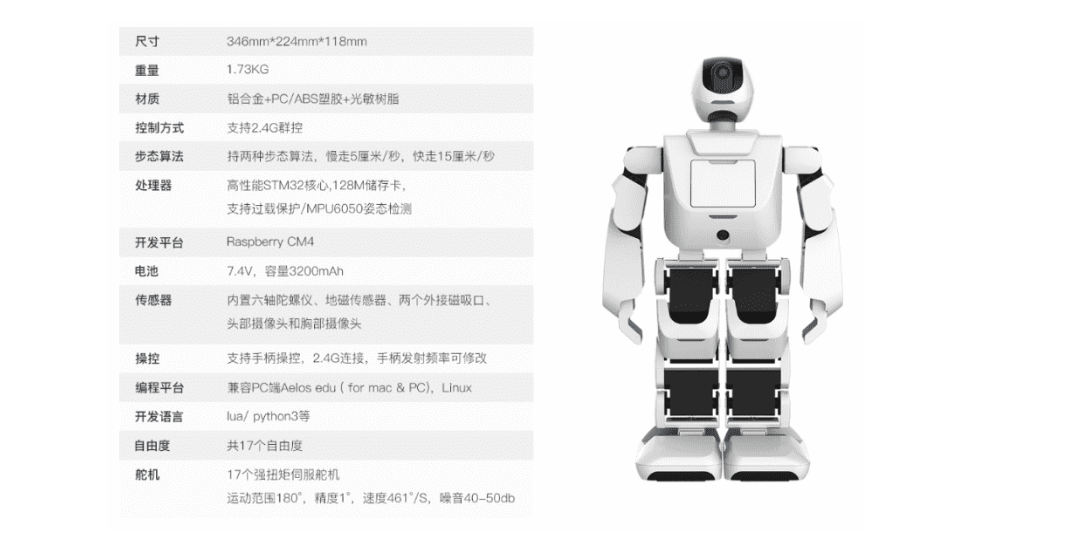 桌面级人形机器人开发套件:是全国机器人锦标赛指定标准平台,可参加中国机器人及人工智能大赛、睿抗机器人开发者大赛、一带一路暨金砖国家技能发展与技术创新大赛、机械行业职业教育技能大赛。该套件在软硬结合,能够充分满足高校对于机器人编程开发、人工智能应用学习等方面的高层次需求,助力高校学子在机器人系统结构、步态规划、运动控制、算法开发、场景应用等方面的实践学习。