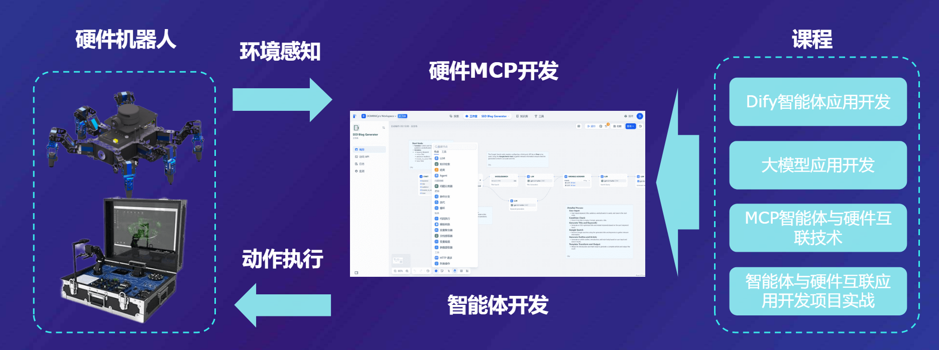 将最新的智能体技术、大模型应用开发技术、大模型与物理世界互联的MCP技术融合,结合硬件机器人或者实验箱等设备,实现智能体控制硬件设备。