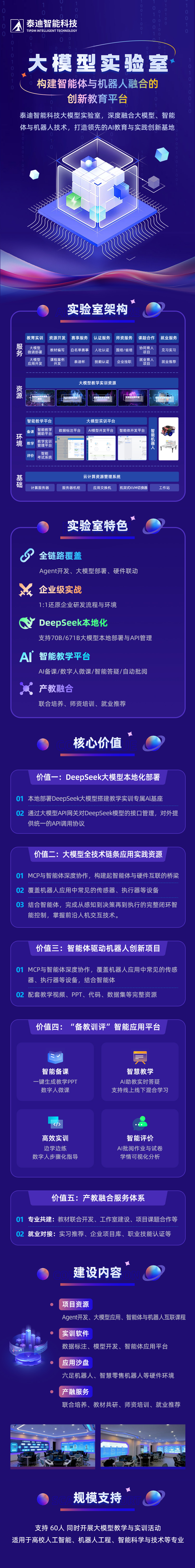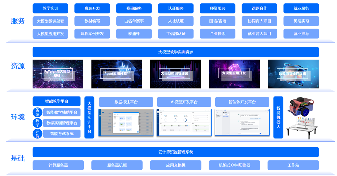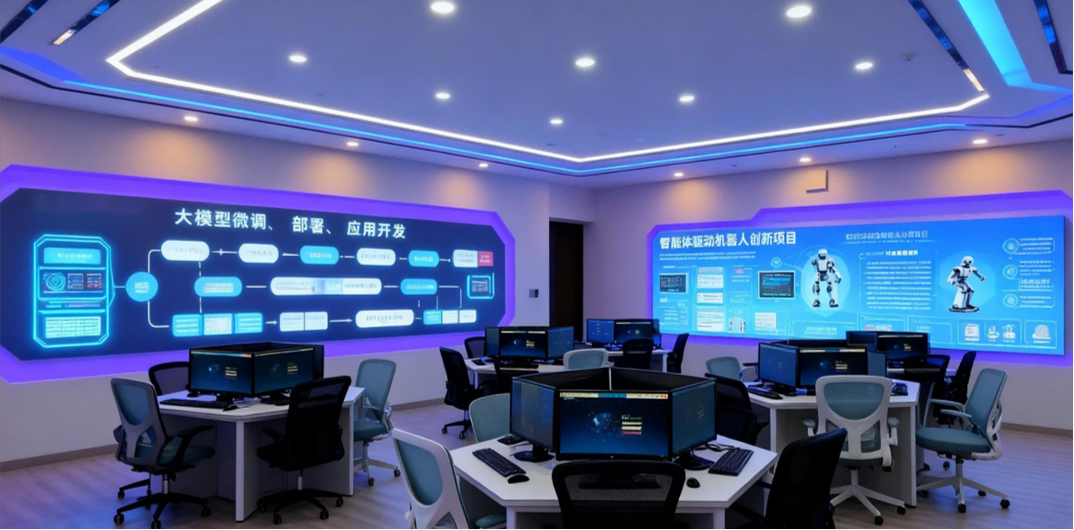 建设内容:项目资源+实训软件+应用沙盘+产融服务,建设满足60人进行大模型教学与实训活动的实验室。
