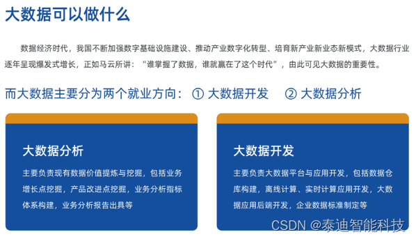 同时大数据培训班出来可以从事两个就业方向,包括:大数据开发及大数据分析。大数据开发方向可以从事大数据开发工程师、网络爬虫工程师、BI开发工程师、ETL开发工程师等;大数据分析方向出来之后可以从事数据分析师、业务分析师、市场分析师等