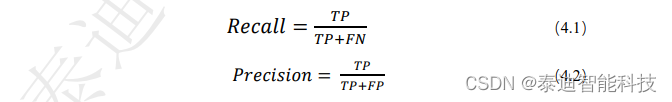 4.1.2 评价指标 目标检测任务可以划分为分类和定位两大任务,其中定位任务采用召回率Recall进 行评估;分类任务采用准确率 Precision 进行评估: