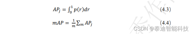 其中,TP 表示检测器输出结果中正确的个数,FP 表示检测器输出的结果中错误的 个数。同时,为了更好地平衡分类和定位任务的重要性,我们引入了以准确率和召回率为变量的 PR 曲线。最终,我们的评估指标转换为单个类别表示为 AP,整体准确率 表示为 mAP:
