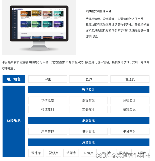 泰迪大数据实训平台从课程管理、资源管理、实训管理等方面出发,主要解决现有实验室无法满足教学需求、传统教学流程和工具低效耗时和内部教学材料无法进行统一管理等问题。