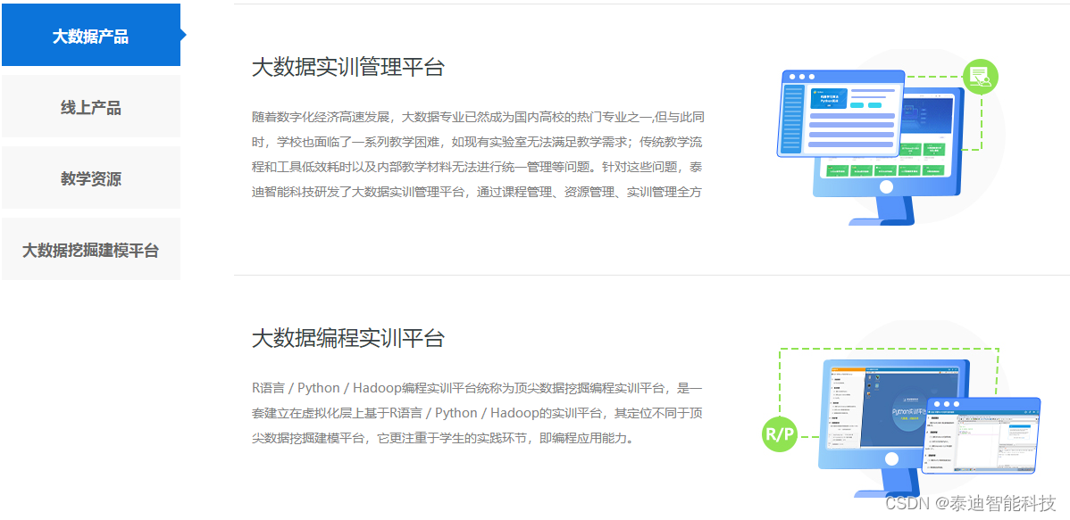 泰迪大数据实训平台包含数据整合与处理平台 、大数据挖掘建模平台、大数据分析可视化平台 、大数据采集平台,四个平台从数据的预处理到数据建模到最后数据的可视化,能让学生拥有完整的体验流程。