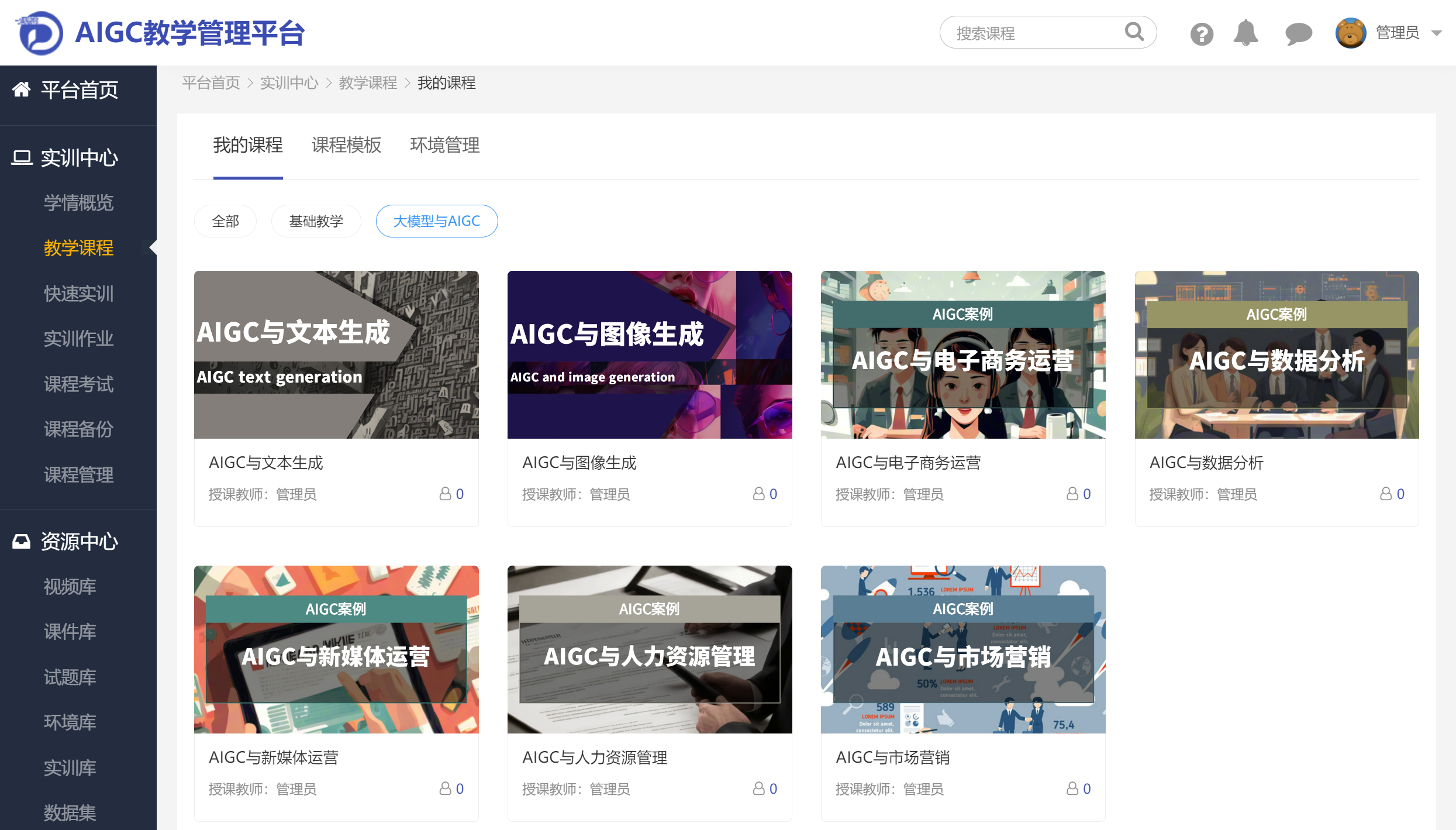 AIGC教学管理平台对所有的课程及实训资源进行统一管理,提供在线学习、实训、考试等教学服务。平台从“课程管理、资源管理、实训管理”等方面出发,主要解决现有实验室无法满足教学需求、传统教学流程和工具低效耗时和内部教学材料无法进行统一管理等问题。平台课程资源包含课件、视频、实训指导书等资源,由浅至深引导学生学习并掌握人工智能知识体系。
