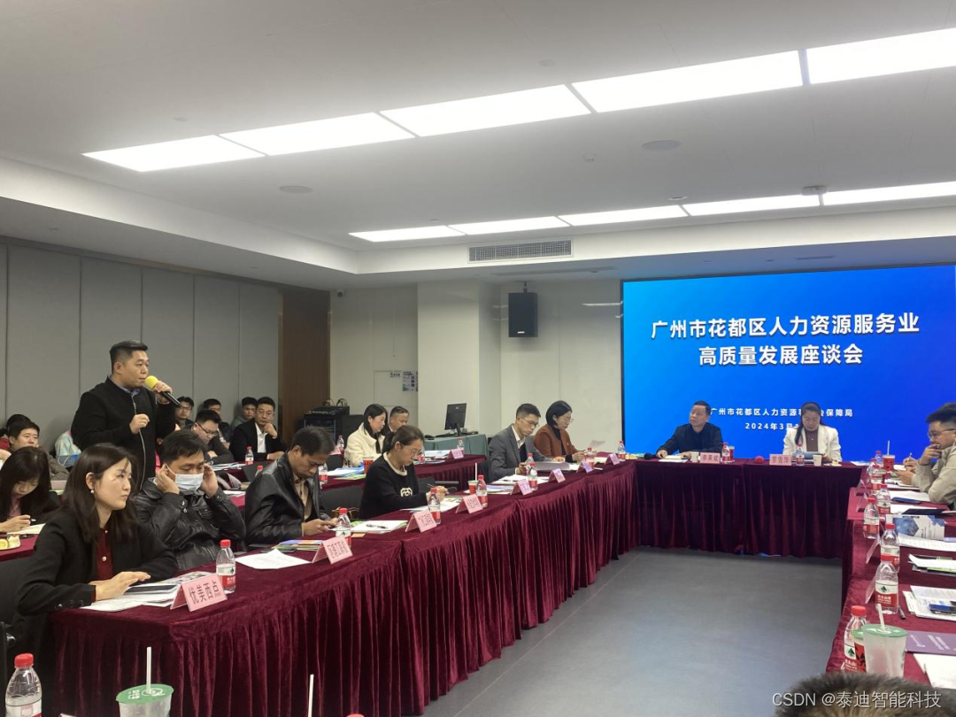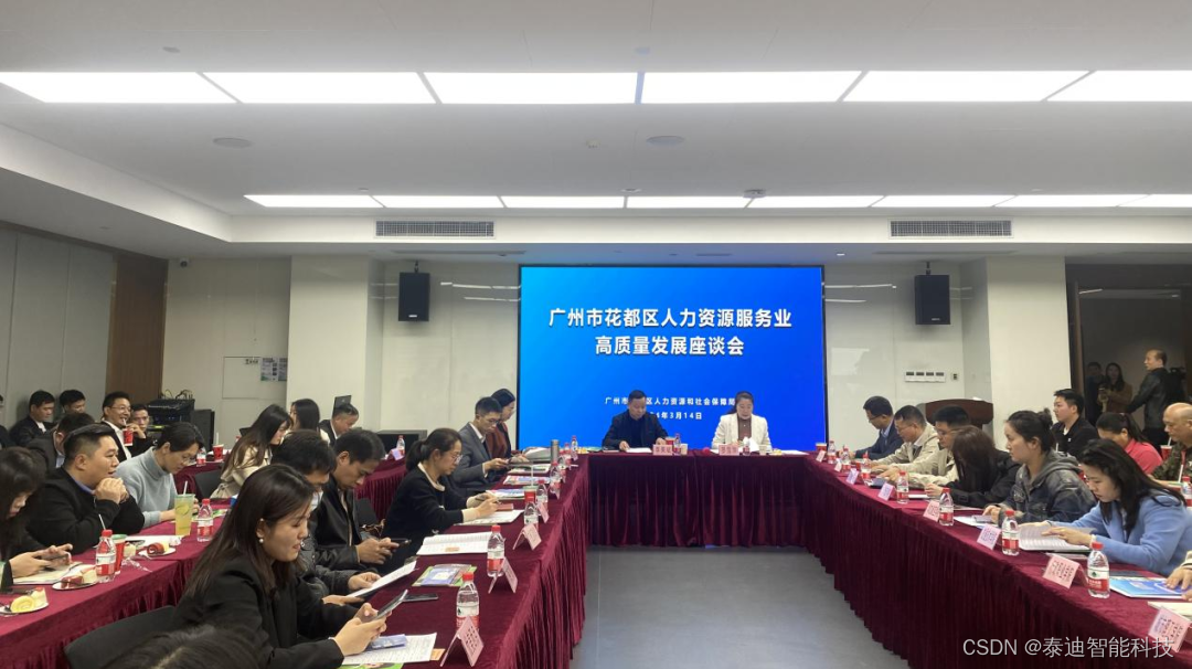 为充分激发人力资源服务机构稳就业促就业作用,有效促进高校毕业生市场化社会化就业,搭建校企对接就业桥梁,广州市花都区人力资源和社会保障局于3月14日下午在空港国际中心举办2024年花都区人力资源服务业高质量发展座谈会。本次座谈会汇聚了花都区人社相关领导、18家院校代表以及花都区内重点企业代表,共同探讨人力资源服务业的发展方向,泰迪智能科技受邀出席本次活动。