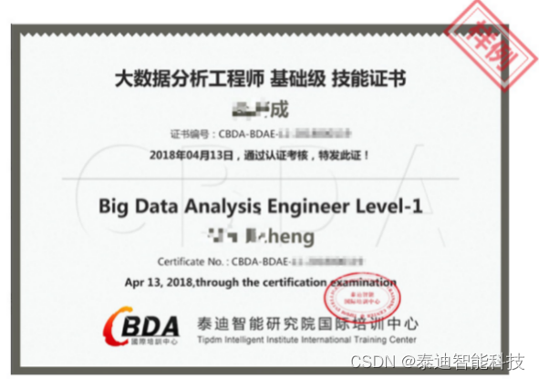 CBDA证书:由泰迪智能研究院国际培训中心颁发的技能证书