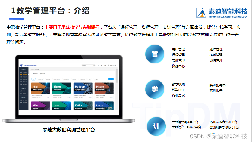 中职教学管理平台:主要用于承载教学与实训课程,平台从“课程管理、资源管理、实训管理"等方面出发,提供在线学习、实训、考试等教学服务,主要解决现有实验室无法满足教学需求、传统教学流程和工具低效耗时和内部教学材料无法进行统一管理等问题。