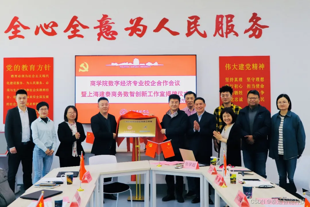 仪式最后,双方举行了“上海建泰商务数智创新工作室””签约挂牌仪式。此次仪式的举行,标志着上海建桥学院与泰迪智能科技在校企合作方面迈出了坚实的一步。