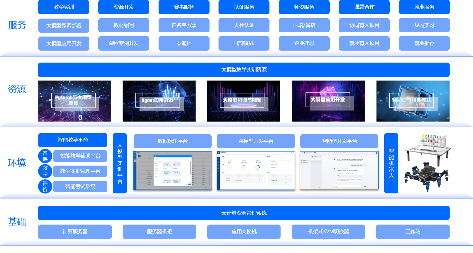高校大模型实训室是一个集教学、实训、创新于一体的综合性解决方案,其核心围绕大模型技术展开。实训室配备了先进的AI编程实训平台和智能体开发平台,支持从大模型应用开发、微调训练到部署实践的全流程教学。它通过提供丰富的课程资源、项目案例和可视化工具,有效降低学习门槛,旨在培养学生掌握智能体(Agent)开发、行业应用集成等前沿技能,为企业输送能快速适应AIGC时代的应用型与技术型人才。