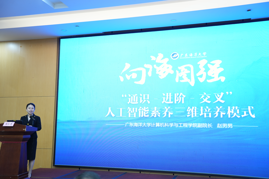 在主题报告环节,广东海洋大学计算机科学与工程学院副院长赵男男作了题为 《向海图强:“通识·进阶·交叉”人工智能素养三维培养模式》 的专题报告,系统阐述了面向智慧海洋领域创新人才培养的先进理念与实践路径。