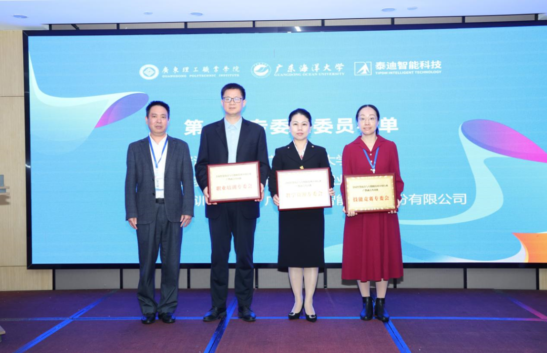 紧接着,会议表决通过了三大专业委员会的第一届委员名单,并举行了隆重的授牌仪式。由广东理工职业学院人工智能学院院长李美满为广东海洋大学计算机科学与工程学院副院长赵男男、广东理工职业学院人工智能学院副院长汪静、广东泰迪智能科技股份有限公司董事长张良均授予专委会牌匾。同时,会议还选举产生秘书长及副秘书长名单,进一步完善组织架构。