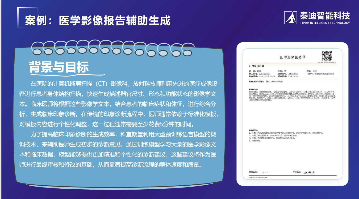 为了提高临床印象诊断的生成效率,科室期望利用大型预训练语言模型的微调技术,来辅助医师生成初步的诊断意见。通过训练模型学习大量的医学影像文本和临床数据,模型能够提供更加精准和个性化的诊断建议。这些建议将作为医师进行最终审核和修改的基础,从而显著提高诊断流程的整体速度和质量。