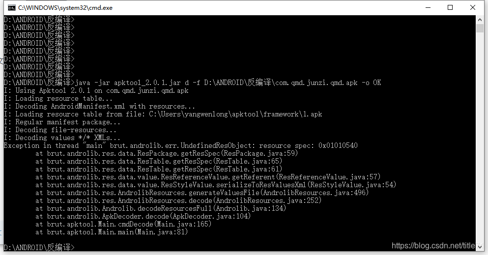 打开cmd命令行,到D:\ANDROID\反编译--------这是我自己的路径