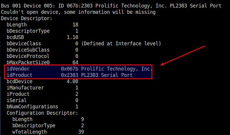 上面lsusb的输出中,找出你的 USB 设备,并找出"idVendor"和"idProduct"字段。本例中,我们的结果是idVendor (0x067b)和 idProduct (0x2303)