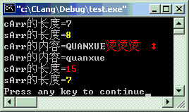 - char sArr[] = "quanxue";也可以写成char sArr[8] = "quanxue";(注意:是8而不是7)