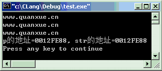 #include<stdio.h>intmain(void) {charstr[80], *p; p = gets(str); puts(p); puts(str); printf("p的地址=%p, str的地址=%p\n", p, str);return0; }
