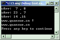 #include<stdio.h>#include<string.h>intmain(void) { //因为最后有NULL,所以这就变成了字符串charcArr[] = {'Q', 'U', 'A', 'N', 'X', 'U', 'E', '\0'}; //因为少定义了一位,最后无NULL,所以这就变成了字符数组charsArr[7] = "quanxue"; //最后一个元素未赋值chartArr[16] = "www.quanxue.cn"; //用sizeof()求长度 printf("cArr: %2d ,%2d\n", strlen(cArr),sizeof(cArr)); printf("sArr: %2d ,%2d\n", strlen(sArr),sizeof(sArr)); printf("tArr: %2d ,%2d\n", strlen(tArr),sizeof(tArr)); //将tArr的最后一个元素赋值,字符串就成了字符数组 tArr[15] = '!'; //作为字符数组,将显示16个字符for(i=0; i<16; i++) printf("%c", tArr[i]); //字符数组的显示方法 //作为字符串,将显示14个字符。 printf("\n%s\n", tArr); //字符串的显示方法return0; }