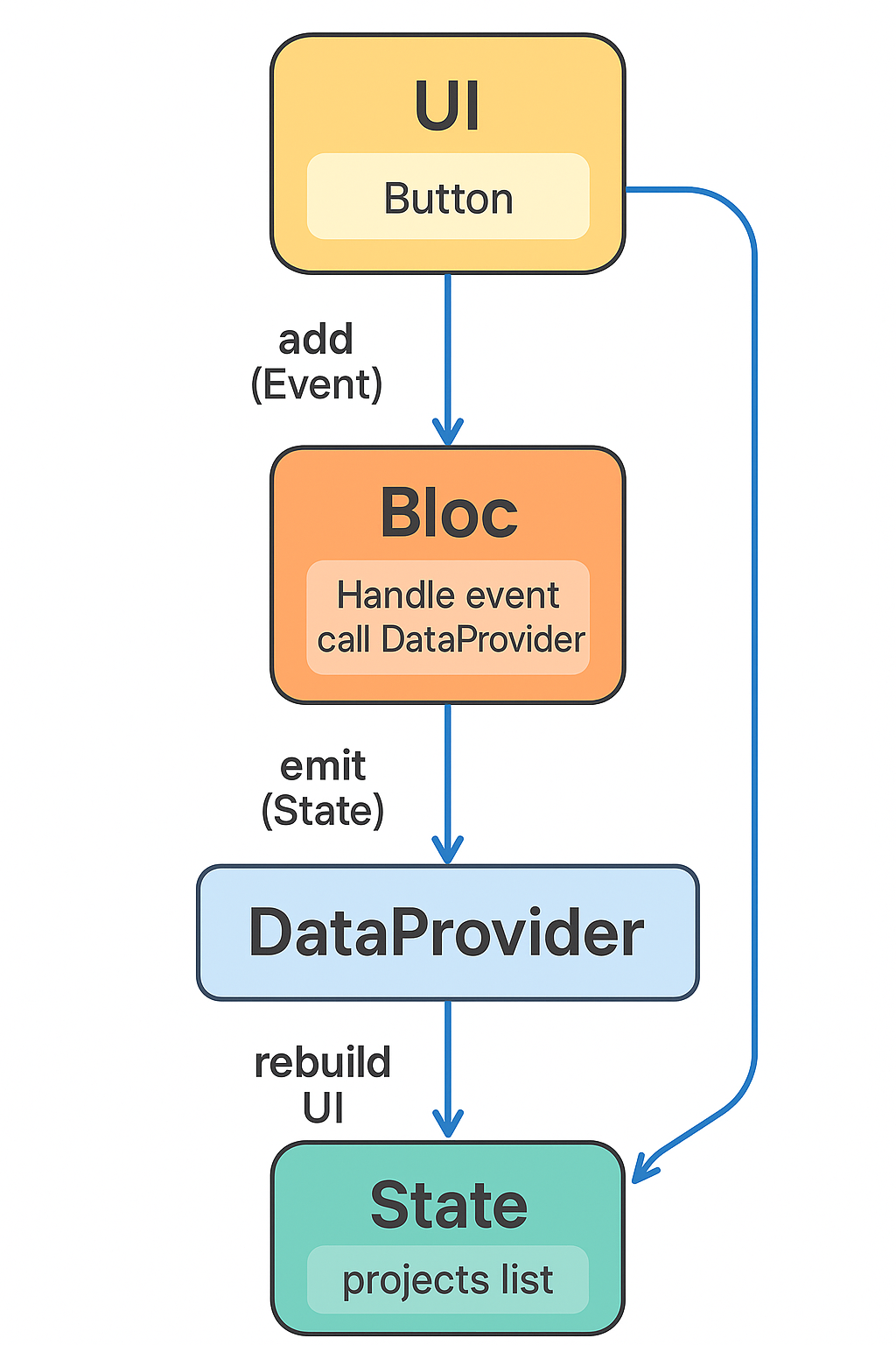 | Bloc 层(业务编排) | projects_bloc.dart | 处理事件 → 调用数据层 → 生成状态 |