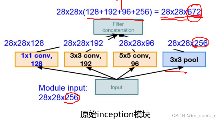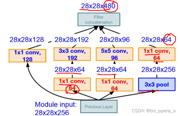 串联不同的filter输出,但出现了参数过多的情况,因此,引入1*1卷积核解决 :