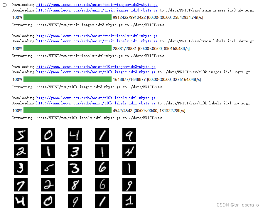 PyTorch里包含了 MNIST, CIFAR10 等常用数据集,调用 torchvision.datasets 即可把这些数据由远程下载到本地,下面给出MNIST的使用方法: