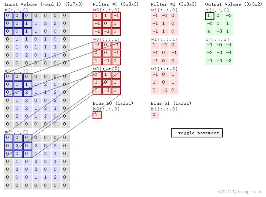 (8)卷积过程:以输入为7*7*3,卷积核大小为3*3,步长为2,padding为1为例: