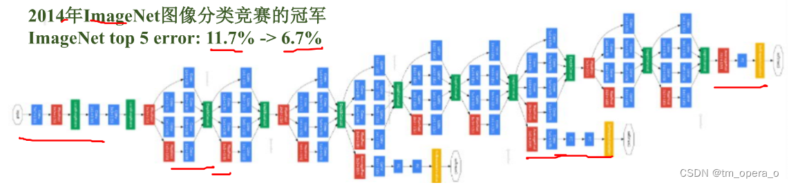 由Stem部分(stem network)(卷积 – 池化 – 卷积 –卷积 – 池化)+多个Inception结构堆叠+输出(除了最后的类别输出层外没有额外的全连接层)