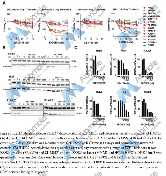| 实验结果 | This loss in viability explains the apparent decrease in detection of total H3 at higher EPZ-6438 doses. It is interesting to note that this loss of H3 detection occurs at higher doses (100–500 nM) than doses required to reduce relative H3K27me3 (10–100 nM). |