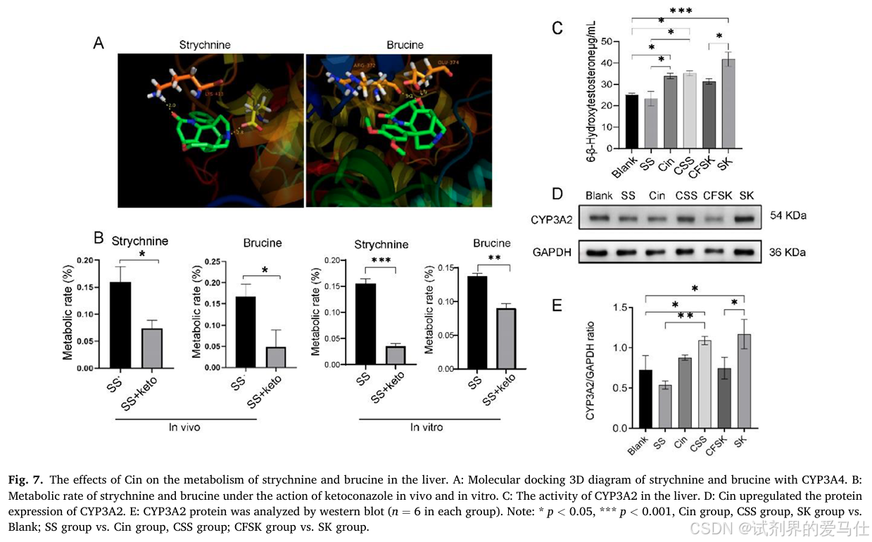 为了验证朱砂是否通过影响CYP3A4酶的活性来抑制马钱子碱的代谢,研究团队利用AbMole公司提供的高纯度重组人CYP3A4酶进行了分子对接和酶活性测定实验。结果显示朱砂能够与CYP3A4酶结合并抑制其活性,从而减少马钱子碱在肝脏中的代谢速率。这一发现为朱砂抑制马钱子碱神经毒性的机制提供了直接证据。