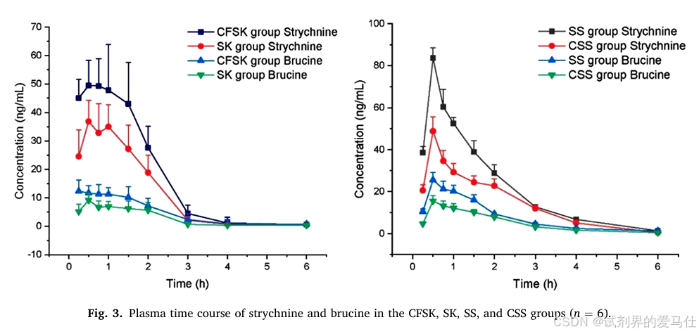 为了进一步探究朱砂的作用机制,研究团队采用药代动力学分析方法,测定了朱砂对马钱子碱在血浆和脑组织中的分布和消除情况。结果显示,朱砂能够显著降低马钱子碱在血浆中的药时曲线下面积(AUC)和最大血药浓度(Cmax),缩短半衰期(T1/2),从而减少马钱子碱在体内的暴露量。这些结果表明朱砂可能通过影响马钱子碱的吸收和代谢来发挥其抑制作用。