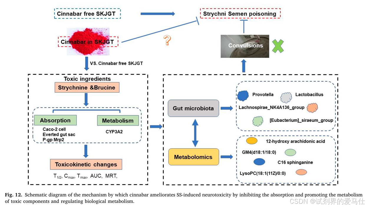 综合以上实验结果,研究团队得出了以下结论:朱砂能够通过多种途径抑制马钱子碱的神经毒性。首先,朱砂能够影响马钱子碱在肠道的吸收和肝脏的代谢过程,从而减少其在体内的暴露量;其次,朱砂能够调节血清代谢物水平以减轻马钱子碱的神经毒性;最后,朱砂还能够通过调节肠道微生物群的组成和结构来进一步减轻马钱子碱的神经毒性。这些机制共同作用使得朱砂在中药配伍中发挥了重要的“驯服”作用。