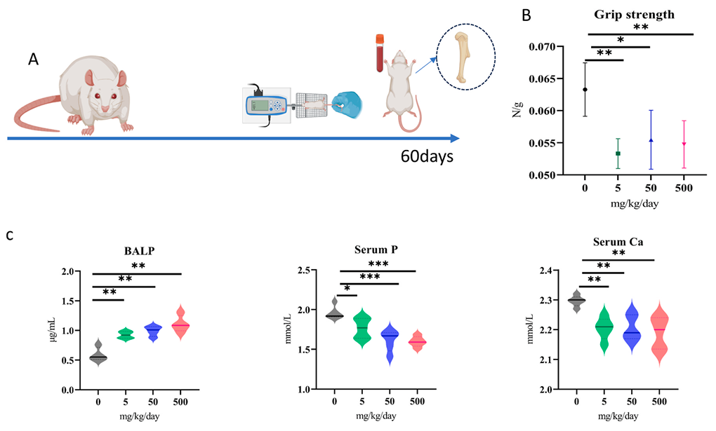 实验过程中,每日监测大鼠体重,并根据 1 mL/100 g 的安全体重标准调整给药体积,且所有动物实验均经过首都医科大学伦理委员会批准(批准号:AEEI-2022-234)。在处理第 57 天,使用 ZS-ZL 型握力测试仪对大鼠前肢握力进行测定,每只大鼠适应环境 1 小时后重复测量 6 次,计算握力与体重的比值作为评估指标。处理结束后,采用三溴乙醇腹腔注射麻醉大鼠,从腹主动脉收集全血,分别置于含促凝剂和分离胶的血清真空采血管以及含 EDTA-K₂的血浆真空采血管中,在 25°C 静置 4 小时后,以 3000 rpm 离心 15 分钟分离血浆和血清。同时,取每只大鼠的单侧肱骨和部分结肠组织用 4% 多聚甲醛固定,其余肱骨和结肠组织则经干冰冷冻后保存于 - 80°C,用于后续各项检测分析。