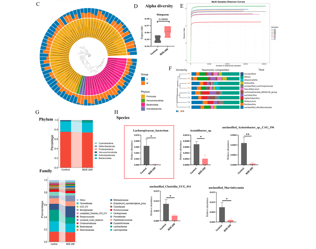 肠道方面,BDE-209 暴露导致大鼠结肠组织出现明显的病理改变,包括肠壁肌层增厚、绒毛表面不规则、U 型隐窝形态异常、杯状细胞数量减少以及炎症细胞浸润,结肠组织中 IL-6、IL-1β 和 TNF-α 的表达也显著增加,与骨组织的炎症反应趋势一致。16S rRNA 测序分析显示,尽管两组的 α 多样性无显著差异,但菌群组成发生改变,其中毛螺菌科(Lachnospiraceae)的丰度显著降低,而毛螺菌科是肠道菌群中产丁酸盐的核心菌属。