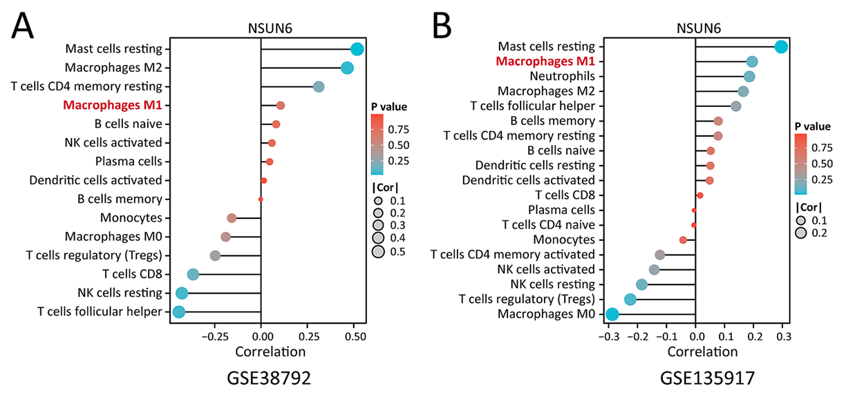 通过 “limma” R 包进行标准化与差异基因分析,筛选出 15 个差异表达的 RNA 修饰调控因子,其中 NSUN6 在 OSA 样本中呈现显著上调。进一步通过单变量 logistic 回归与 LASSO 回归构建风险模型,发现 NSUN6 与其他 6 个调控因子(IGF2BP3、ELAVL1、TRMT61A、TRMT61B、CPSF3、CSTF3)共同构成诊断模型,其中 NSUN6 的 ROC 曲线下面积(AUC)达 0.824,提示其潜在的诊断价值。
