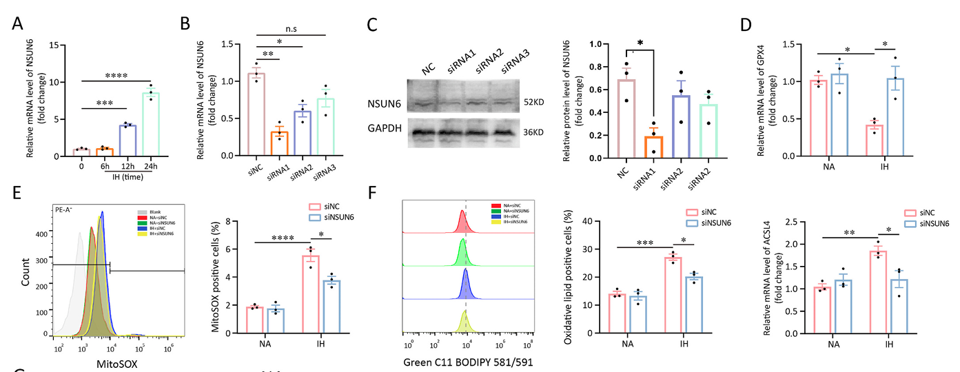 体外实验中,IH 处理可时间依赖性上调 RAW 264.7 细胞中 NSUN6 的 mRNA 表达,24 小时时达峰值(3.2 倍)。NSUN6 敲低后,IH 诱导的铁死亡标志物变化被显著逆转:GPX4 mRNA 水平回升 60%,ACSL4 mRNA 水平下降 45%,线粒体 ROS 生成减少 52%,脂质过氧化水平降低 48%。透射电镜观察显示,IH 处理导致巨噬细胞线粒体肿胀、嵴断裂及空泡化,而 NSUN6 敲低可显著改善线粒体形态。