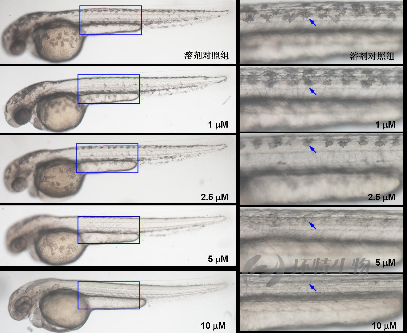 斑马鱼作为一种生物模型为研究色素细胞的发生调控机制提供了有利工具。斑马鱼的神经源性色素细胞包括黑色素细胞、黄色素细胞、晕色素细胞。斑马鱼的胚胎发育过程在体外进行,大约24小时即形成由黑色素细胞和晕色素细胞形成的几条深色带。斑马鱼模型为研究色素细胞的发生、分化及色素性疾病的发病机制提供了有利手段。环特生物利用斑马鱼成功建立了祛斑剂筛选模型,用于评价与筛选治疗色素沉着性疾病或黑色素瘤的药物。