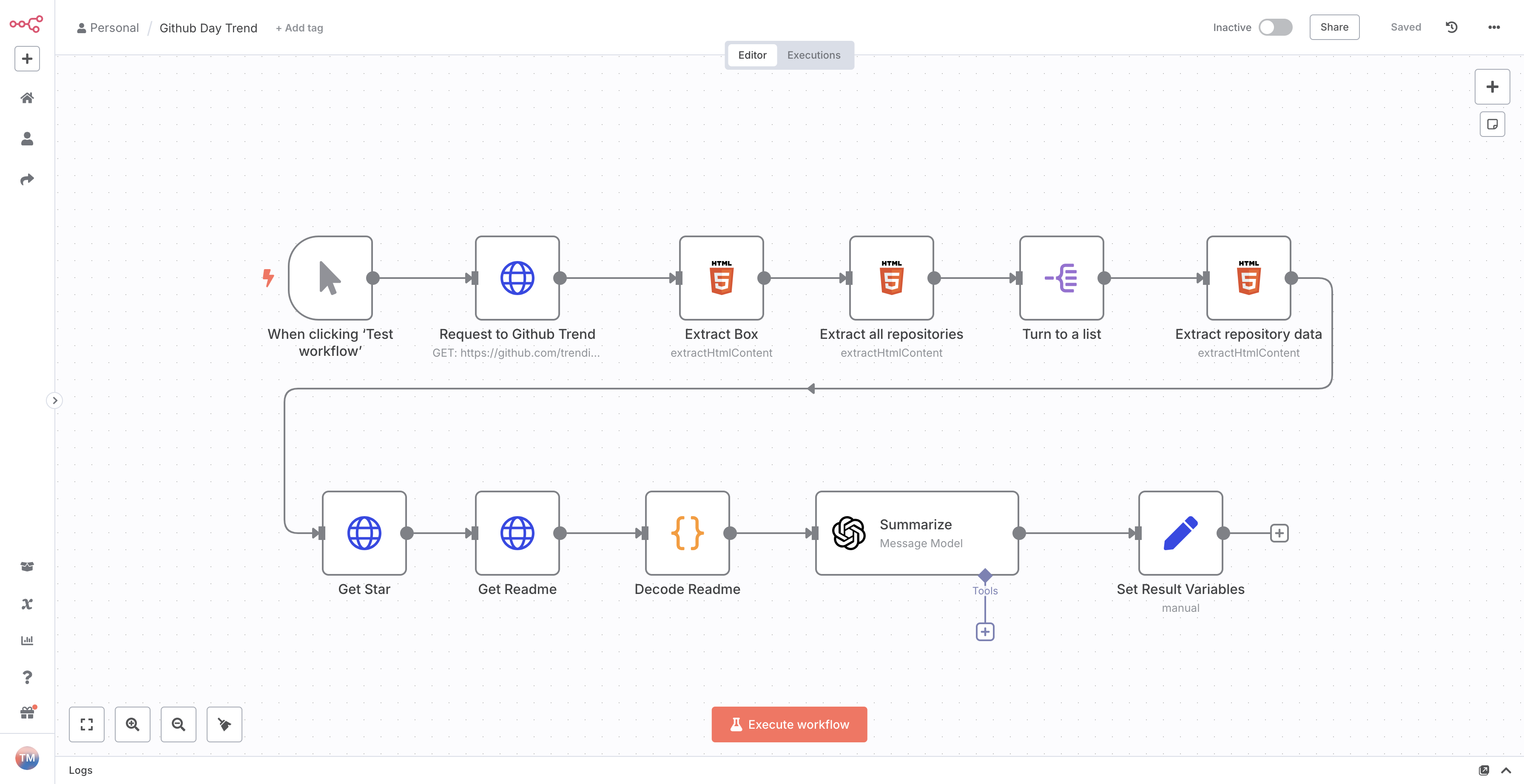 Github Day Trend 是一套使用 n8n 搭建的自动化工作流,能够每日自动抓取 GitHub Trending 页的热门开源项目,提取核心信息(如项目名称、作者、描述、语言、Star 数等),并借助 AI 自动生成简明项目摘要,最终输出结构化的热门项目数据。