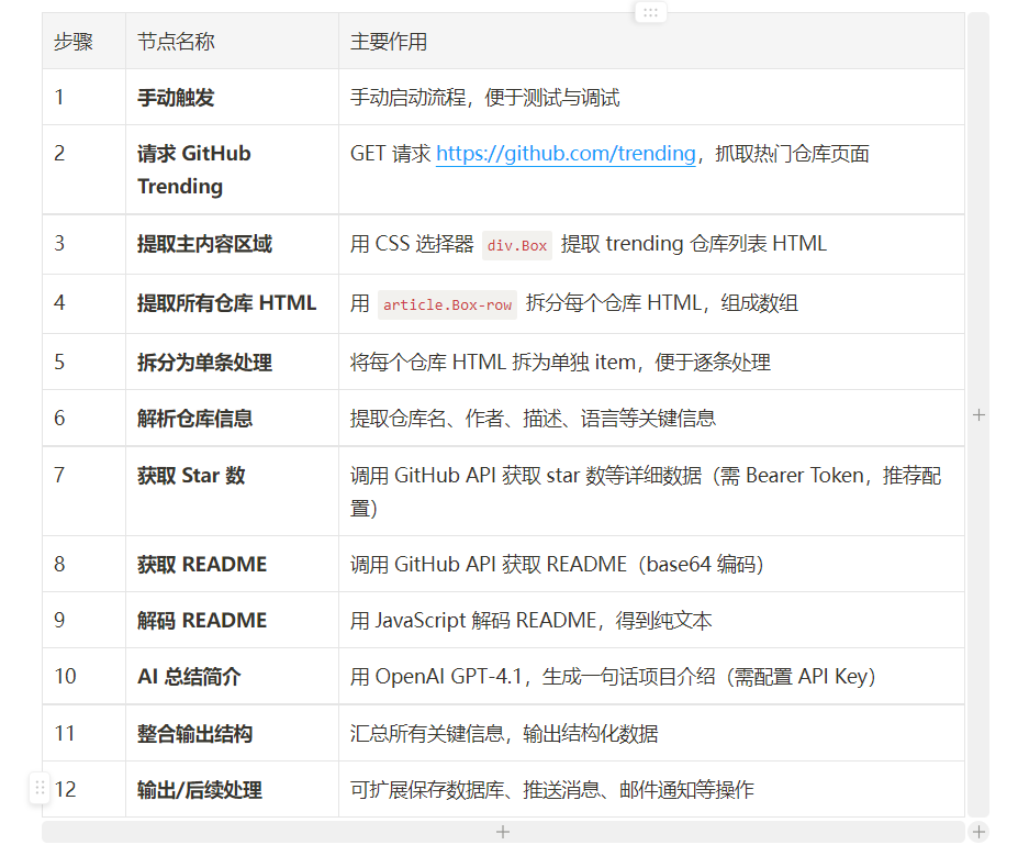 Github Day Trend 工作流,极大简化了 GitHub 热门项目的每日采集、整理与分发流程,为技术团队、内容运营与开发者提供了高效的自动化工具。通过 n8n 的可视化与可扩展性,用户可根据需求灵活集成更多后续操作。