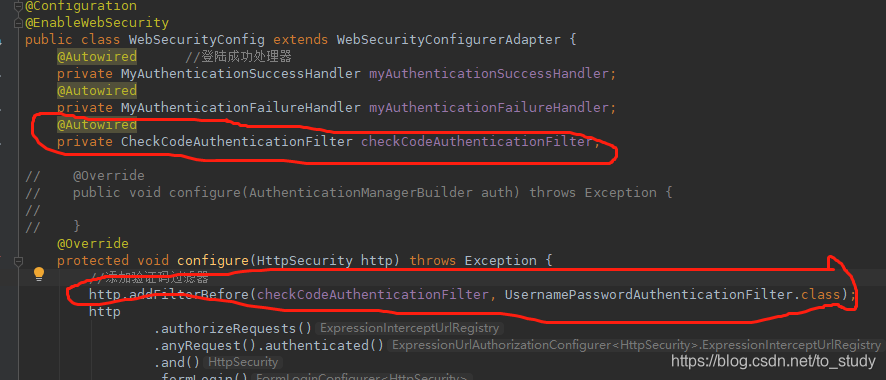 //验证码验证过滤器,继承OncePerRequestFilter,该过滤器作用于账户密码过滤器前 @Component public class CheckCodeAuthenticationFilter extends OncePerRequestFilter { @Autowired private MyAuthenticationFailureHandler myAuthenticationFailureHandler; @Override protected void doFilterInternal(HttpServletRequest request, HttpServletResponse response, FilterChain filterChain) throws ServletException, IOException { //判断当前请求是否是登陆请求 if (request.getRequestURI().contains("/securityLogin")) { //检验验证码 try { //用户输入的验证码 final String imageCode = request.getParameter("code"); //获取系统生成的验证码 String key = (String) request.getSession().getAttribute("checkCode"); if (key == null || key == "") { throw new CheckCodeException("请勿重复登陆"); } if (!imageCode.trim().equalsIgnoreCase(key.trim())) { //抛出自定义验证码异常 throw new CheckCodeException("验证码错误"); } } catch (AuthenticationException e) { //交给authenticationFailureHandler(自定义登陆失败处理器)处理 myAuthenticationFailureHandler.onAuthenticationFailure(request, response, e); return; } } //验证码正确放行 filterChain.doFilter(request, response); } } - 在配置类中将验证码过滤器放在security的过滤链中,并放在靠前面的,账号密码验证之前