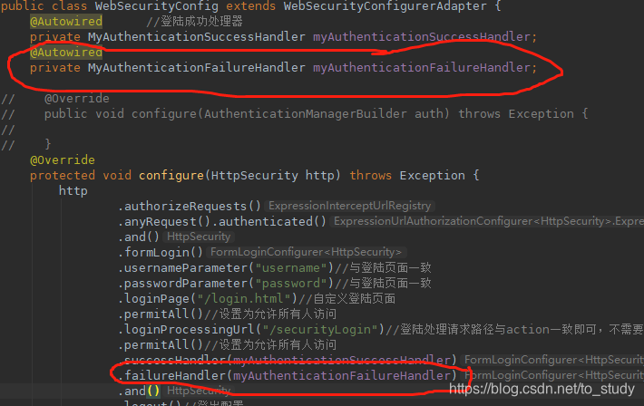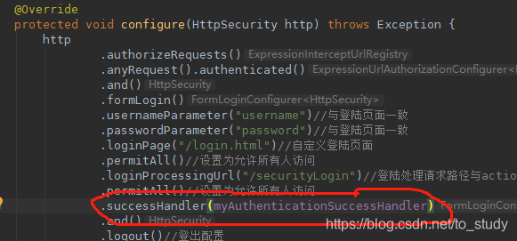 - void configure(HttpSecurity http):配置security的流程及工作组件,如处理器,过滤器,remenber-me等等