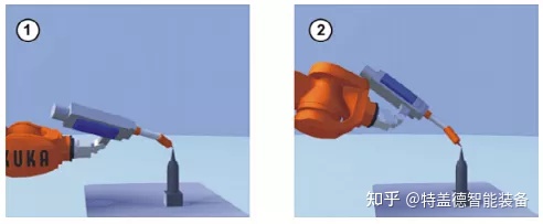 2.标定方法:(1)工具坐标标定的方法往往是4点法标定(各牌子方法不一定一致),在机器人附近找一点,使工具中心点对准该点,保持工具中心点丌发,发换夹具的姿态,共记录四次,即可自动生成工具坐标系的参数。