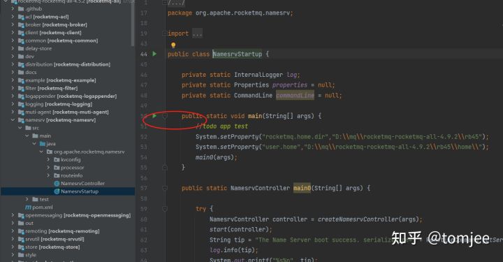 找到 src\main\java\org\apache\rocketmq\namesrv\NamesrvStartup.java ,开心的执行main方法,